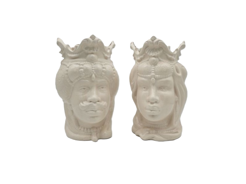 Questa splendida coppia di Teste di Moro in ceramica di Caltagirone incarna la maestria artigianale siciliana, con decorazioni vivaci e dettagli dipinti a mano. Ispirate alla leggenda dell’amore e della passione che caratterizza queste icone della tradizione siciliana, le teste raffigurano un nobile moro e una dama impreziositi da colori intensi e motivi ornamentali.