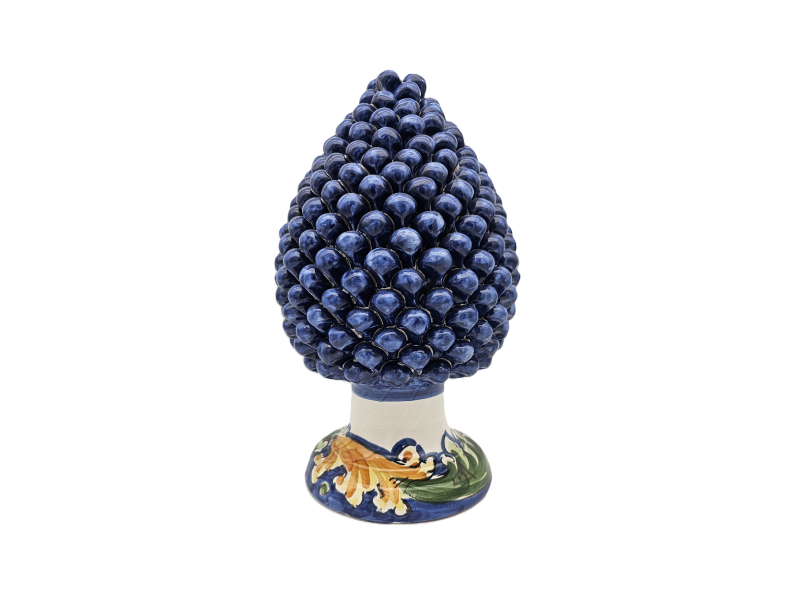 Pigna in ceramica artigianale di Caltagirone blu con piede decorato con foglie alternare verde e arancio giallo h 40