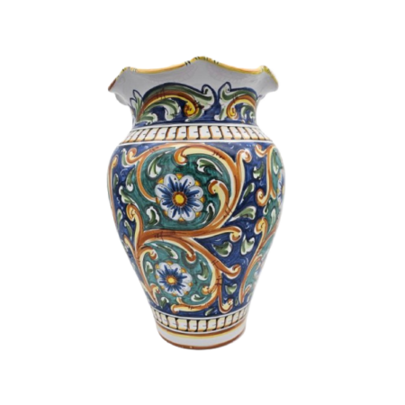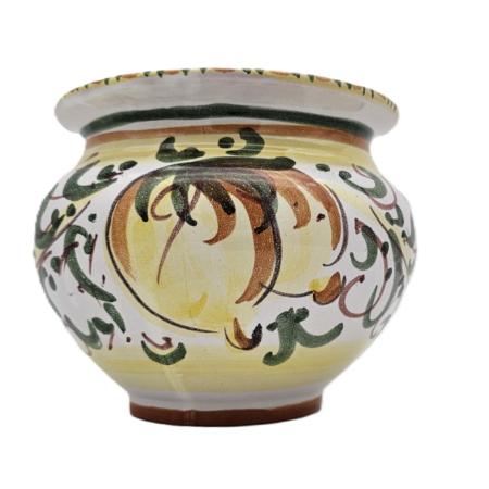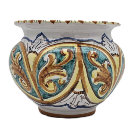 Pigna in ceramica artigianale di Caltagirone h25 con piede decorato co foglie d acanto con fondo rosso