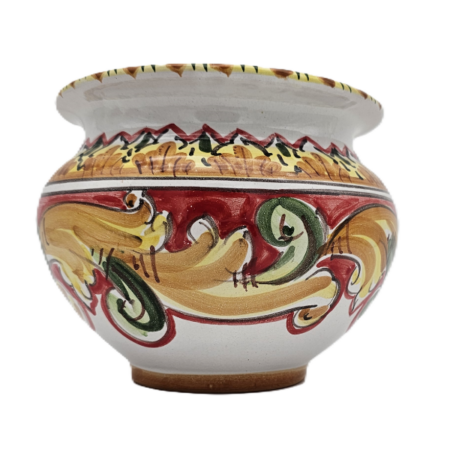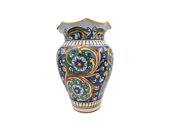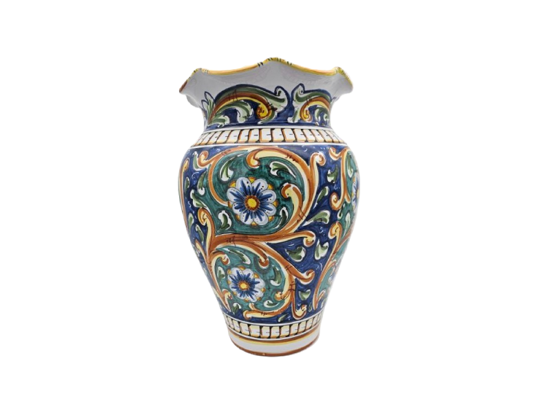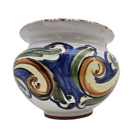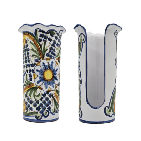 Interamente realizzato e dipinto a mano dai maestri ceramisti, questo portaombrelli si distingue per la sua eleganza e raffinatezza. La decorazione, ispirata allo stile barocco siciliano, presenta motivi floreali armoniosi con dettagli curati nei minimi particolari. Le tonalità vibranti di blu, verde, giallo e arancio richiamano i colori della Sicilia, conferendo un tocco di classe e vivacità all’ambiente.